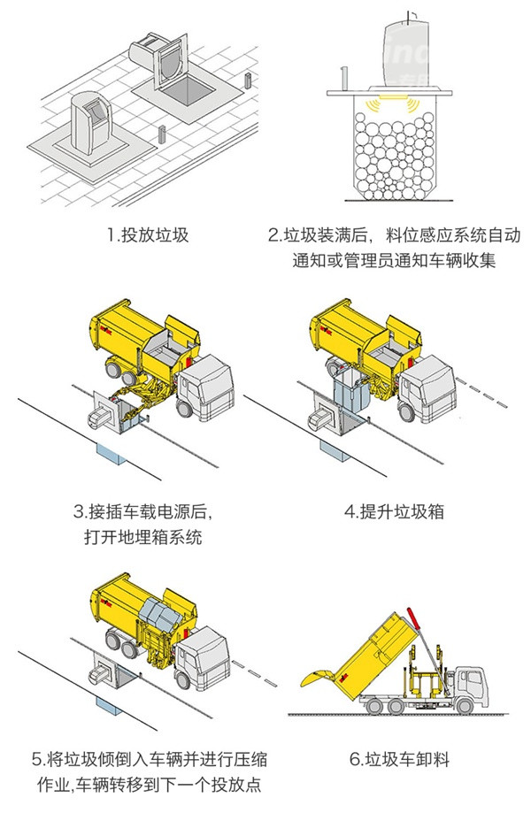 地埋垃圾桶不需提供動力,選址更具靈活性,在城市和農(nóng)村均可安裝,標準容積3.5m3、3m3、2.5m3和2m3,地埋桶提料機構既適配袋裝垃圾投料,也適配手推車或電動垃圾收集車投料。