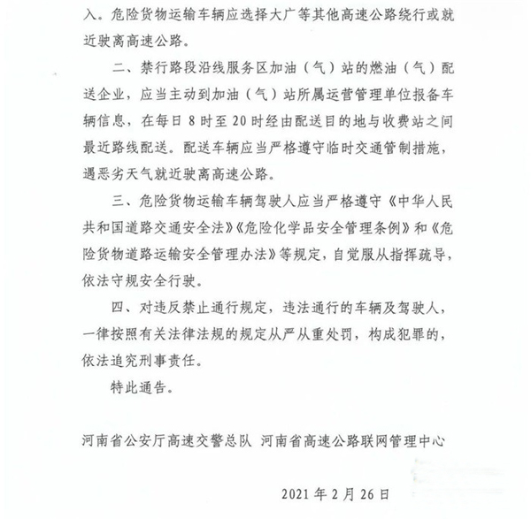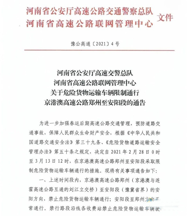 為進一步加強春運后期高速公路交通管理,預(yù)防道路交通事故,保障人民群眾生命財產(chǎn)安全,根據(jù)《中華人民共和國道路交通安全法》第三十九條、《危險貨物道路運輸安全管理辦法》第五十條之規(guī)定,決定自2021年2月28日0時至3月13日12時,在京港澳高速公路鄭州至安陽段采取限制危險貨物運輸車輛通行的措施?,F(xiàn)將有關(guān)事項通告如下: