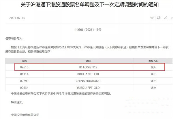 上交所:將京東物流調(diào)入港股通股票名單