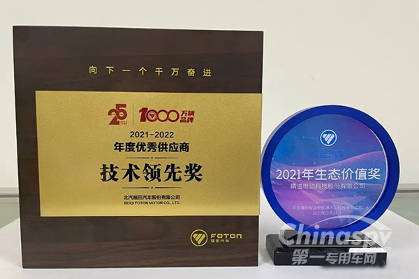 2022年1月7日第一專用車網記者獲悉,近日,北汽福田汽車2022全球合作伙伴大會供應商大會在北京召開。大會以“新形勢·新模式·新目標引領供應鏈變革”為主題,錨定目標,共創(chuàng)未來。全球供應商共計776家云上相聚,共議發(fā)展大計。在本次主題大會上,福田汽車集團領導對2021年優(yōu)秀供應商進行了表彰,其中精進電動從眾多供應商中脫穎而出,獲得福田汽車2021-2022年度優(yōu)秀供應商技術領先獎。在其后的福田智藍汽車分會上,精進電動又榮獲了分量最重的福田智藍汽車2021年生態(tài)價值獎。