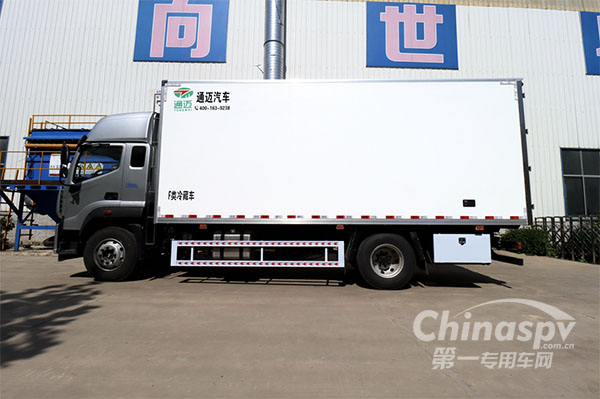胡守鵬透露,通邁冷藏車芯層為聚氨酯泡沫板保溫材料,聚氨酯板之間為玻璃鋼加強筋,聚氨酯泡沫板導(dǎo)熱系數(shù)小于0.021W/MK,箱體總傳熱系數(shù)小于0.4W/MK,廂體無金屬冷橋,導(dǎo)熱率低,保溫性能優(yōu)良。板塊粘接用高強度、高密封性膠合劑,形成一個整體,耐腐蝕性好。廂體采用高分子聚酯材料熱壓成型,獨特的全封閉結(jié)構(gòu),可能耐一般濃度的酸堿鹽大部分有機溶劑、海水、油類的腐蝕,廂式使用時間更長。外飾件采用304食品級不銹鋼外制件和鋁制件,經(jīng)久耐用。一體化的內(nèi)部加強筋,極大的增加了廂板強度。