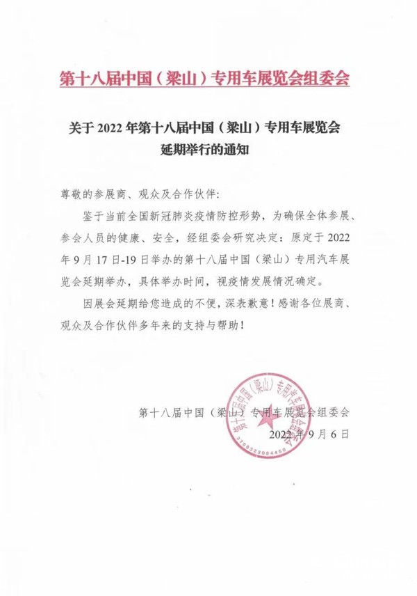 第十八屆中國(梁山)專用汽車展覽會延期舉辦