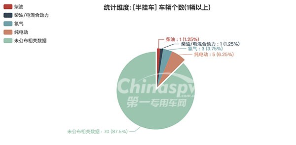 本次公告中的80款半掛車中,柴油(1輛,占比1.25%)、柴油/電混合動力(1輛,占比1.25%)、氫氣(3輛,占比3.75%)、純電動(5輛,占比6.25%)、未公布相關(guān)數(shù)據(jù)(70輛,占比87.5%)。