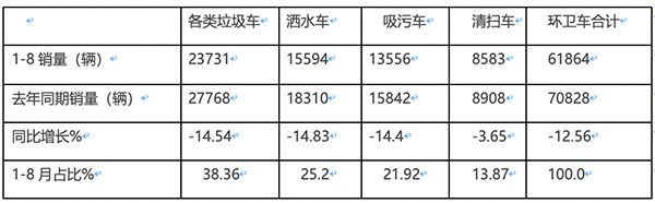 上表顯示,今年1-8月各類(lèi)環(huán)衛(wèi)車(chē)銷(xiāo)量、同比及占比呈現(xiàn)以下特點(diǎn):