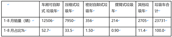 前8月環(huán)衛(wèi)車(chē)市場(chǎng)簡(jiǎn)析: 垃圾車(chē)居榜首程力奪冠,新能源亮眼!
