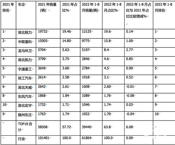 表5,根據(jù)終端上牌信息(不含出口),2022年1-8月環(huán)衛(wèi)車(chē)銷(xiāo)量TOP10占比與2021年占比比較: