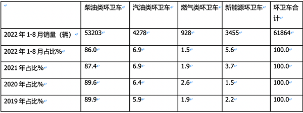 上圖表可見(jiàn),按動(dòng)力燃料種類(lèi)劃分,在2022年1-8月環(huán)衛(wèi)車(chē)銷(xiāo)量結(jié)構(gòu)中: