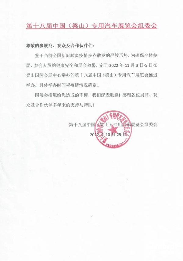 2022年10月26日,第十八屆中國(梁山)專用汽車展覽會組委會發(fā)布通知,鑒于全國疫情形勢嚴峻復雜,經(jīng)組委會評估展會效果,原定于2022年11月3日-5日在梁山國際會展中心舉辦的第十八屆中國(梁山)專用汽車展覽會推遲舉辦,具體舉辦時間另行通知。有關(guān)展會的其他事宜請與組委會聯(lián)系,電話0537-7300988。