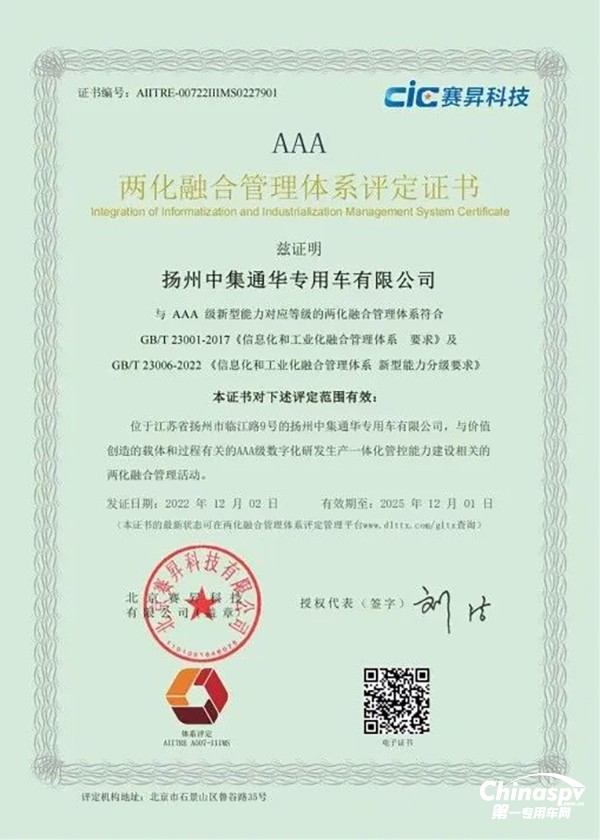 2022年12月2日,揚(yáng)州中集通華專用車有限公司正式獲得國(guó)家工信部?jī)苫诤显u(píng)定機(jī)構(gòu)簽發(fā)的“兩化融合管理體系A(chǔ)AA級(jí)評(píng)定證書(shū)”,成為國(guó)內(nèi)半掛車行業(yè)首家通過(guò)兩化融合AAA級(jí)認(rèn)證的企業(yè)。