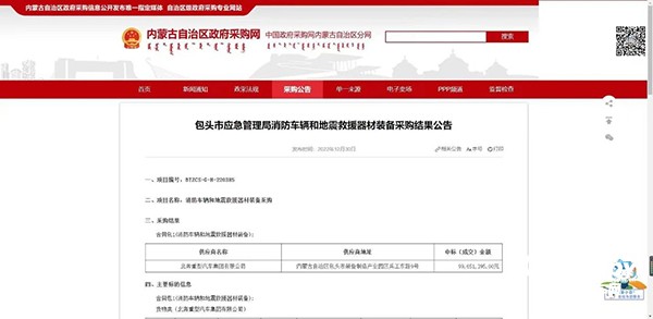 2022年12月30日,內(nèi)蒙古自治區(qū)政府采購網(wǎng)發(fā)布了《包頭市應急管理局消防車輛和地震救援器材裝備采購結果公告》,北奔重汽成功中標包頭市應急管理局消防車輛和地震救援器材裝備采購項目,中標(成交)金額近億元。