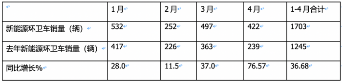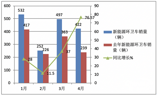 ---今年4月新能源環(huán)衛(wèi)車銷量同比增長76.57%,跑贏今年4月環(huán)衛(wèi)車大盤24.49增速近52.08個百分點;