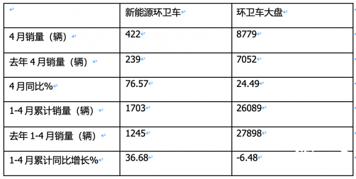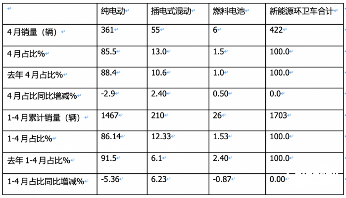 上表顯示:在今年4月及1-4月各類新能源環(huán)衛(wèi)車銷量及占比中: