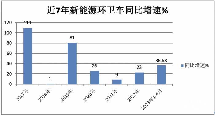 根據(jù)觀研天下數(shù)據(jù),20217年—2022年新能源環(huán)衛(wèi)車同比增速如截圖1,而2023年前4月新能源環(huán)衛(wèi)車同比增速為36.68%,居近年7年第三,