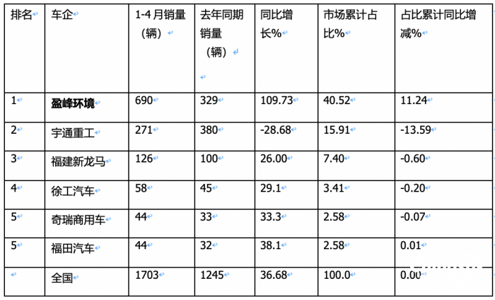 2023年1-4月新能源環(huán)衛(wèi)車市場:同比“4連增”,盈峰環(huán)境領(lǐng)漲領(lǐng)跑、宇通、新龍馬分列二、三?