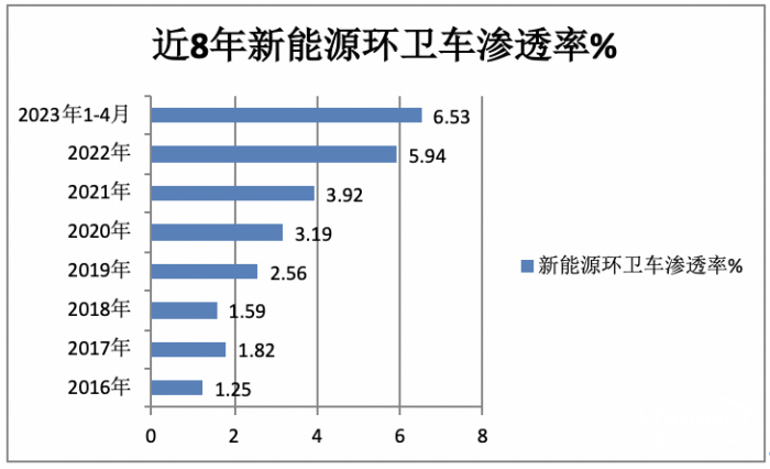 上圖可見,2023年1-4月新能源環(huán)衛(wèi)車市場滲透率為6.53%,創(chuàng)近8年新高,這是今年前4月新能源環(huán)衛(wèi)車市場一個明顯特點。根據(jù)調(diào)研分析,主要原因有: