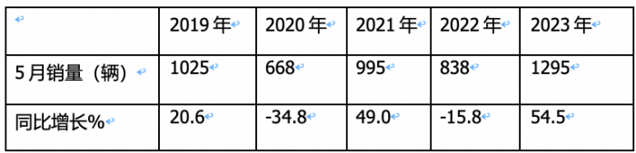 上表顯示,2023年5月國產(chǎn)底盤自行式房車銷量1295輛,創(chuàng)近5年同期新高。從同比增幅看,其增幅為54.5%,也居近5年同期第一。