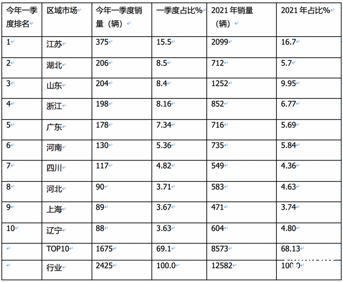 表5,根據(jù)終端上牌信息,2022年一季度銷量TOP10區(qū)域排行: