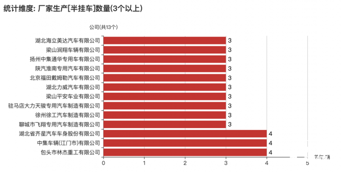 采用3軸的半掛車企業(yè)以及數(shù)量如下:包頭市林杰重工有限公司(4輛)、湖北省齊星汽車車身股份有限公司(4輛)、北京福田戴姆勒汽車有限公司(3輛)、梁山平安車業(yè)有限公司(3輛)、揚(yáng)州中集通華專用車有限公司(3輛)、陜汽淮南專用汽車有限公司(3輛)、徐州徐工汽車制造有限公司(3輛)、梁山潤翔車輛有限公司(3輛)、湖北力威汽車有限公司(3輛)、中集車輛(江門市)有限公司(3輛)、湖北海立美達(dá)汽車有限公司(3輛)、河北宏泰專用汽車有限公司(2輛)、四川同輝專用車制造有限公司(2輛)、山西晨豐汽車制造有限公司(2輛)、梁山旭日精工機(jī)械制造有限公司(2輛)、河北昌驊專用汽車有限公司(2輛)、山東梁山華宇集團(tuán)汽車制造有限公司(2輛)、梁山盛匯專用車輛有限公司(2輛)、蕪湖中集瑞江汽車有限公司(2輛)、中集車輛(集團(tuán))股份有限公司(2輛)、河北長征汽車制造有限公司(2輛)、東莞中集專用車有限公司(2輛)、山東天鴻汽車科技股份有限公司(2輛)、中國第一汽車集團(tuán)有限公司(2輛)、安徽華興車輛有限公司(2輛)、江蘇浩旭專用汽車有限公司(2輛)、洛陽中集凌宇汽車有限公司(2輛)、山東李帆重工機(jī)械有限公司(2輛)、駐馬店大力天駿專用汽車制造有限公司(2輛)、上汽依維柯紅巖商用車有限公司(2輛)、山東鑫泰專用汽車制造有限公司(2輛)、山東翔通汽車制造有限公司(2輛)等