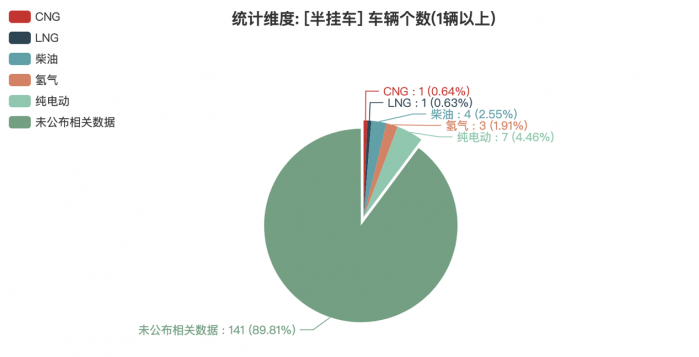 本次公告中的157款半掛車中,CNG(1輛,占比0.64%)、LNG(1輛,占比0.64%)、柴油(4輛,占比2.55%)、氫氣(3輛,占比1.91%)、純電動(7輛,占比4.46%)、未公布相關(guān)數(shù)據(jù)(141輛,占比89.81%)。