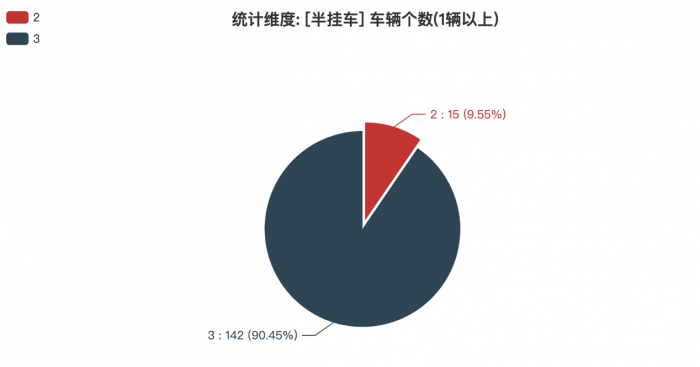 本次公告中的157款半掛車中,2軸(15輛,占比9.55%)、3軸(142輛,占比90.45%)。