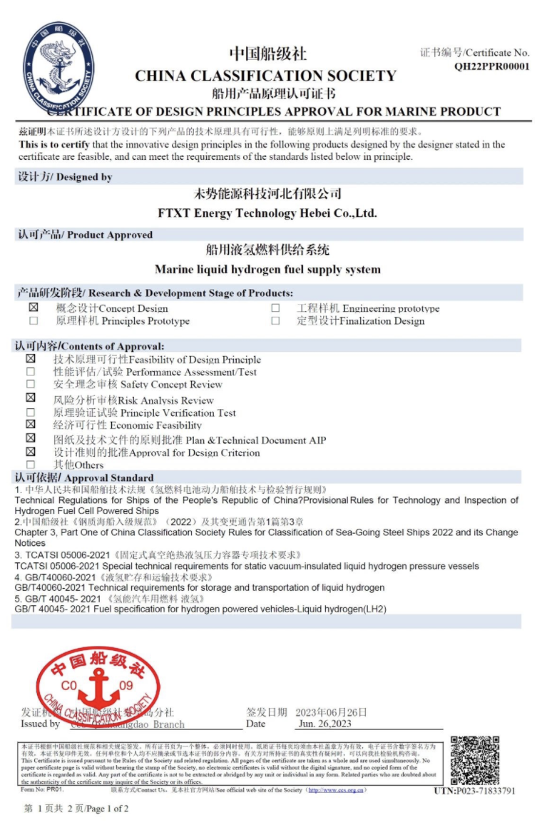 國內(nèi)首張!未勢能源船用液氫供給系統(tǒng)獲得中國船級社CCS認證