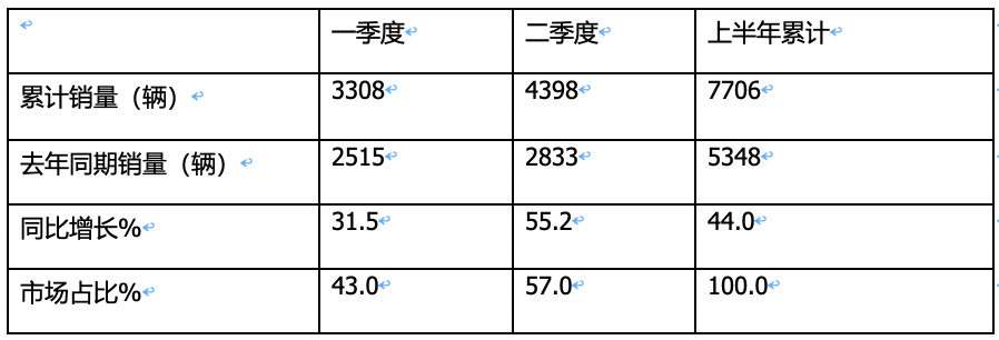 ---今年二季度房車累計銷售4398輛,同比增長55.2%,跑贏上半年房車市場44%的增速近11.2個百分點;市場占比為57%,居于主體地位。