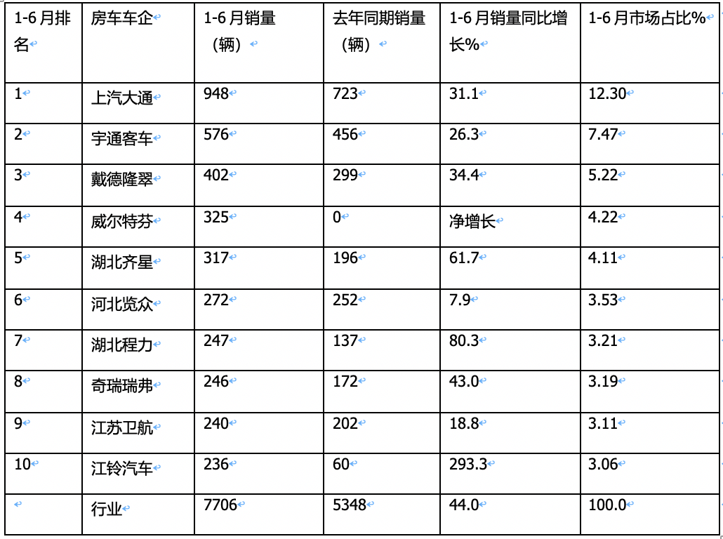 實銷7706輛增44%,大通、宇通、戴德隆翠居前三-2023年上半年國產底盤自行式房車銷量特點簡析