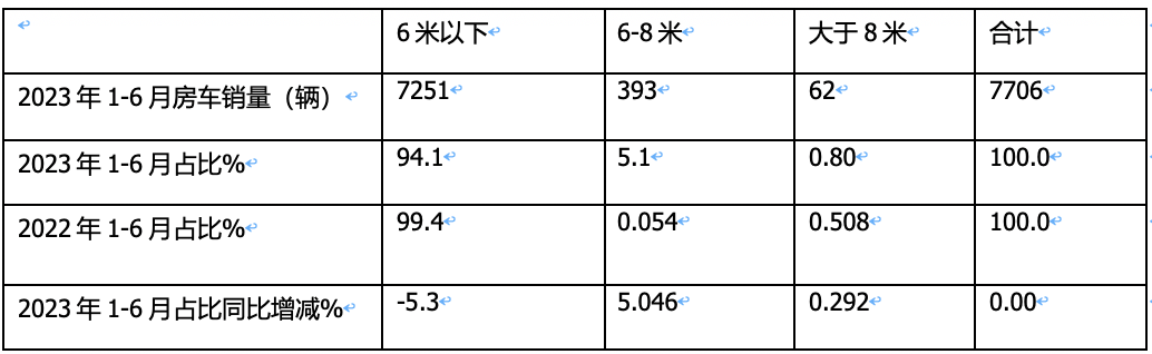 表4,按車型長度段劃分,2023年1-6月與2022年同期房車市場銷量及占比同比增減統(tǒng)計(數據來源:終端上牌信息)