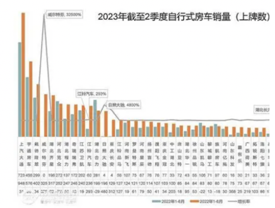 截圖2,2023年1-6月主流車企的國產自行式房車銷量及同比(數據來源:21世紀房車提供的上牌信息)