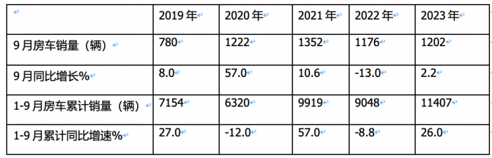 ---2023年9月房車銷量1202輛,居近5年同期第三,屬于中等水平;從同比增速看,同比增長2.2%,是近5年同期增增速第四的年份。