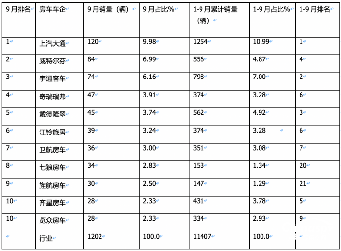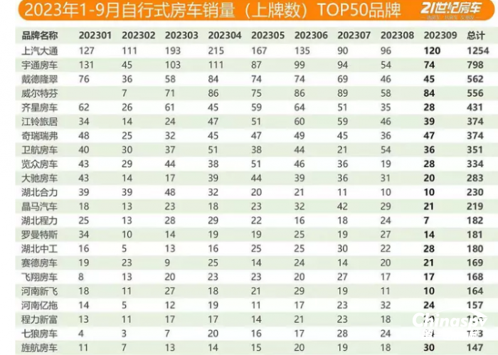 2023年9月國產(chǎn)底盤自行式房車銷量特點:銷1202輛同環(huán)比“雙增”,大通、威特爾芬、宇通居前三