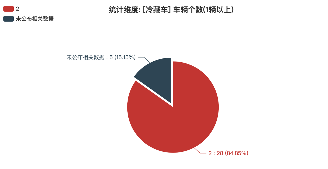 本次公告中的33款冷藏車中,2軸(28輛,占比84.85%)、未公布相關(guān)數(shù)據(jù)(5輛,占比15.15%)。