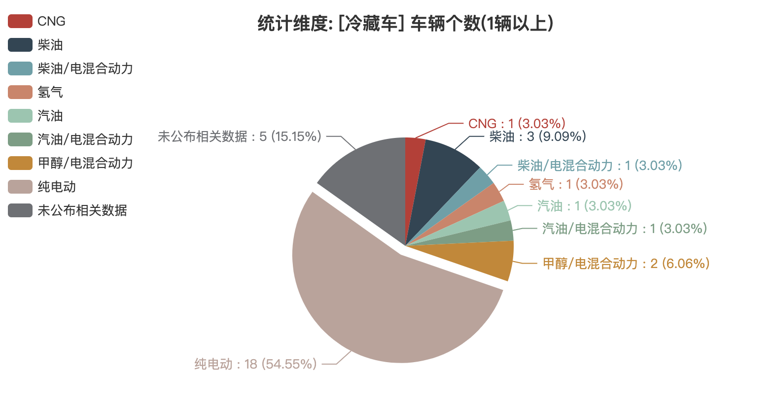 本次公告中的33款冷藏車中,CNG(1輛,占比3.03%)、柴油(3輛,占比9.09%)、柴油/電混合動力(1輛,占比3.03%)、氫氣(1輛,占比3.03%)、汽油(1輛,占比3.03%)、汽油/電混合動力(1輛,占比3.03%)、甲醇/電混合動力(2輛,占比6.06%)、純電動(18輛,占比54.55%)、未公布相關(guān)數(shù)據(jù)(5輛,占比15.15%)。