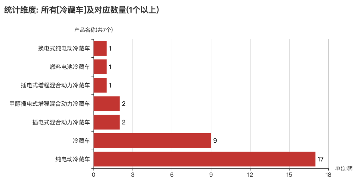 本次公告中的33款冷藏車的車型共有7種,純電動冷藏車(17輛)、冷藏車(9輛)、插電式混合動力冷藏車(2輛)、甲醇插電式增程混合動力冷藏車(2輛)、插電式增程混合動力冷藏車(1輛)、燃料電池冷藏車(1輛)、換電式純電動冷藏車(1輛)。