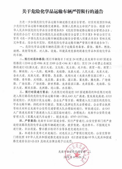 凡在限行時(shí)段途經(jīng)105國道路段的和在限行時(shí)段進(jìn)入限行路段的危險(xiǎn)化學(xué)品運(yùn)輸車輛一律從G45大廣高速、復(fù)線南龍高速、G535國道繞行,涉及國計(jì)民生運(yùn)輸、企業(yè)生產(chǎn)等方面,確需進(jìn)入化工園區(qū)的危險(xiǎn)化學(xué)品運(yùn)輸車輛,持機(jī)動(dòng)車行駛證、駕駛?cè)思把哼\(yùn)員從業(yè)資格證、企業(yè)營業(yè)執(zhí)照等相關(guān)材料至龍南市公安局交通管理大隊(duì)辦理臨時(shí)通行,審批通過后,由G45大廣高速龍南南下高速進(jìn)入化工園區(qū)臨時(shí)通行,辦理地點(diǎn):龍南市公安局交通管理大隊(duì)(客屬大道汽車站旁),聯(lián)系電話:0797-3557586。