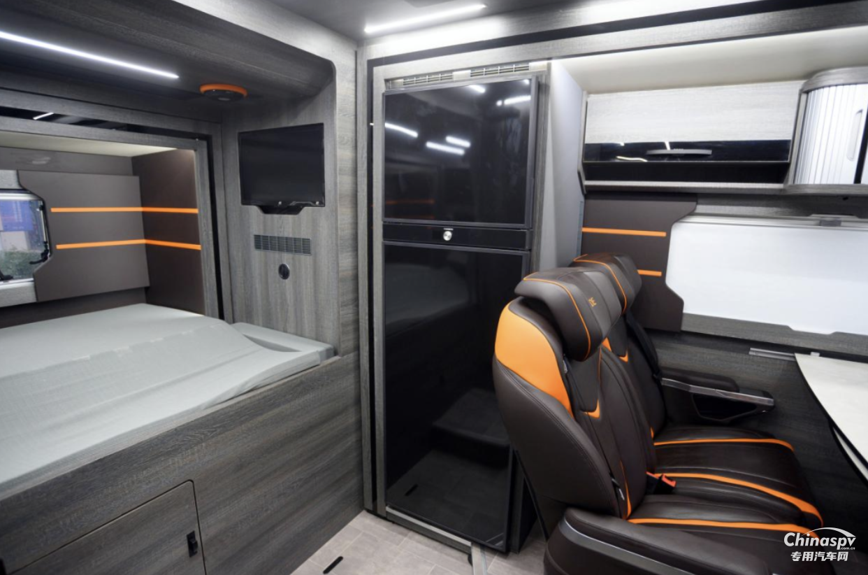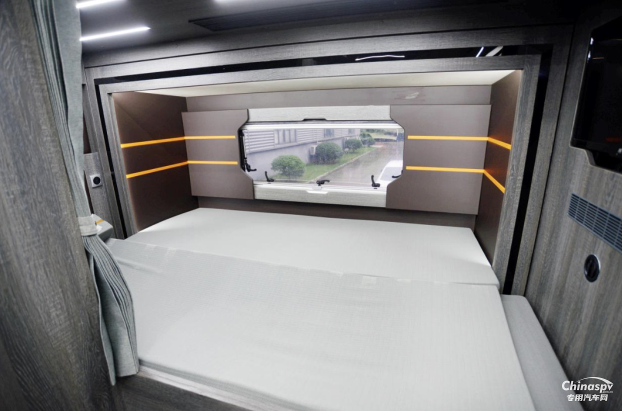 車尾為固定橫床布局,拓展展開后整個(gè)區(qū)域可以供兩人睡臥使用,床鋪標(biāo)配有慢回彈海綿床墊,保障了用戶睡臥的舒適。床鋪前方配有一臺電視機(jī),內(nèi)側(cè)設(shè)計(jì)有電源接口、閱讀燈、置物格等設(shè)施,豐富的便利性設(shè)施帶來更優(yōu)的旅居體驗(yàn)。