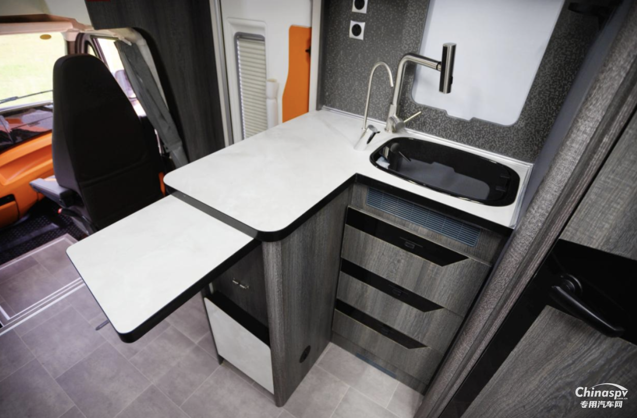 廚房區(qū)為L型布局,側(cè)面設(shè)計(jì)有拓展板可臨時(shí)增加操作臺面積,此處為用戶配備了直飲水系統(tǒng)、多功能洗菜盆、電磁爐、微波爐等生活設(shè)施,會客區(qū)后方配置了一臺224L冰箱,擁有冷凍冷藏功能,用戶可以在旅居時(shí)攜帶新鮮食物。