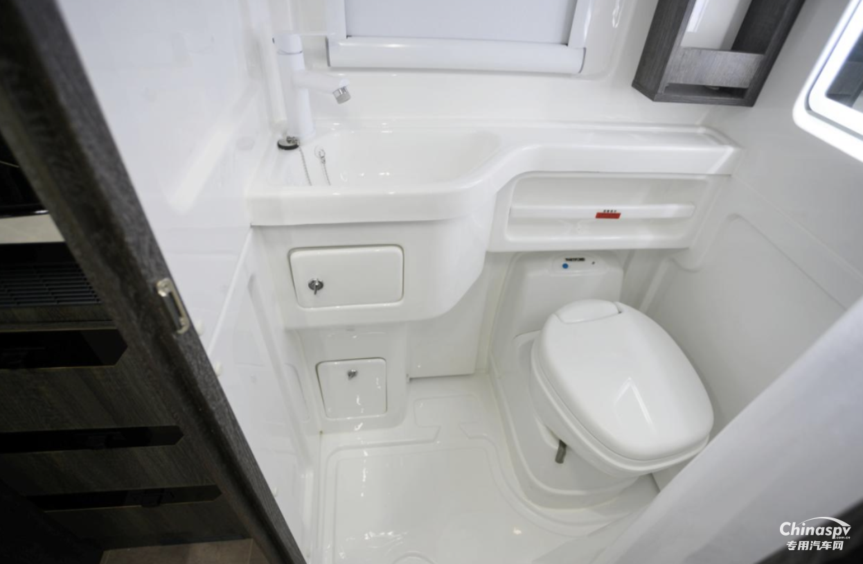 衛(wèi)浴間為吸塑一體式設(shè)計(jì),內(nèi)部配備有除霧鏡、賽特福德坐便器、換氣扇等,衛(wèi)浴設(shè)施齊全,保障了用戶旅居淋浴洗漱等需求。考慮到旅居時(shí)衣物清潔問題,賽德在車廂內(nèi)部為用戶配備了一臺大宇3kg洗烘一體機(jī),清洗衣物更加方便。