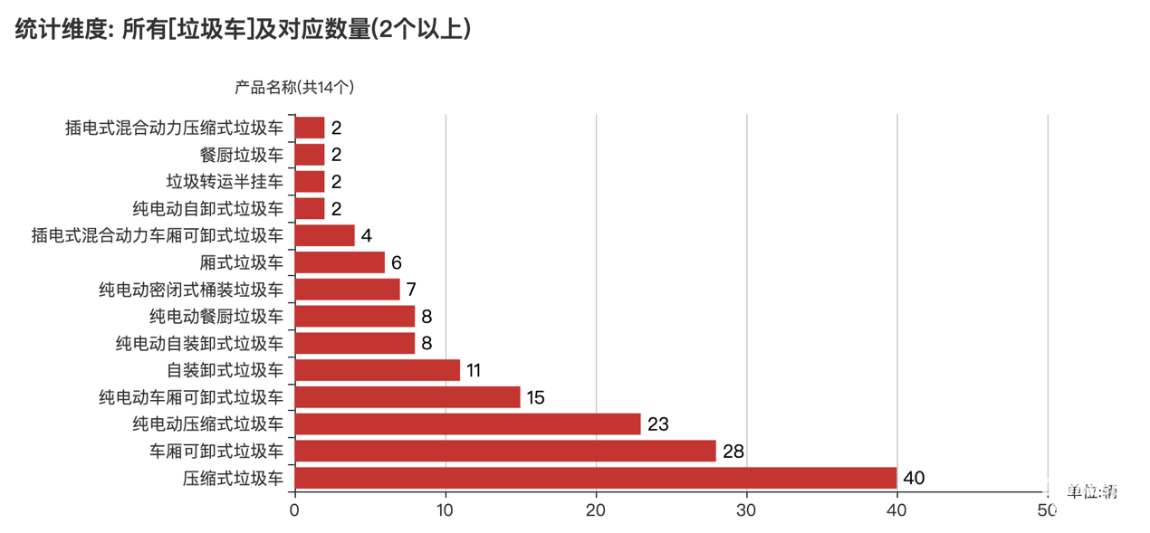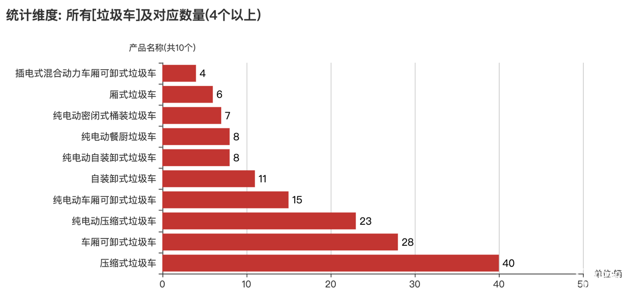 本次公告中的165款垃圾車的車型共有21種,壓縮式垃圾車(40輛)、車廂可卸式垃圾車(28輛)、純電動壓縮式垃圾車(23輛)、純電動車廂可卸式垃圾車(15輛)、自裝卸式垃圾車(11輛)、純電動自裝卸式垃圾車(8輛)、純電動餐廚垃圾車(8輛)、純電動密閉式桶裝垃圾車(7輛)、廂式垃圾車(6輛)、插電式混合動力車廂可卸式垃圾車(4輛)、餐廚垃圾車(2輛)、純電動自卸式垃圾車(2輛)、插電式混合動力壓縮式垃圾車(2輛)、垃圾轉運半掛車(2輛)、換電式純電動車廂可卸式垃圾車(1輛)、自卸式垃圾車(1輛)、純電動垃圾轉運車(1輛)、換電式純電動自卸式垃圾車(1輛)、純電動桶裝垃圾運輸車(1輛)、純電動分撿垃圾運輸車(1輛)、純電動廂式垃圾車(1輛)。
