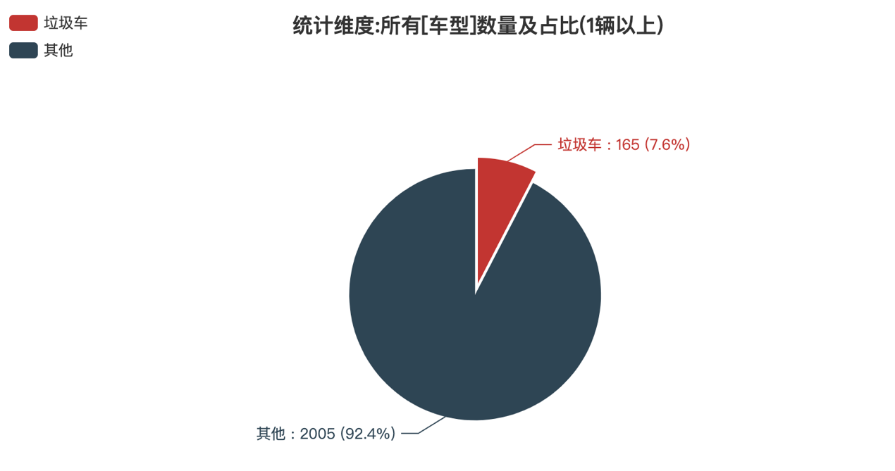 第385批新車產品公示中的2170輛產品中,垃圾車(165輛,占比7.6%)。