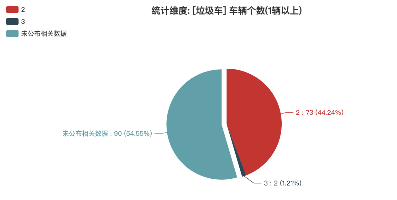 本次公告中的165款垃圾車中,2軸(73輛,占比44.24%)、3軸(2輛,占比1.21%)、未公布相關數(shù)據(jù)(90輛,占比54.55%)。