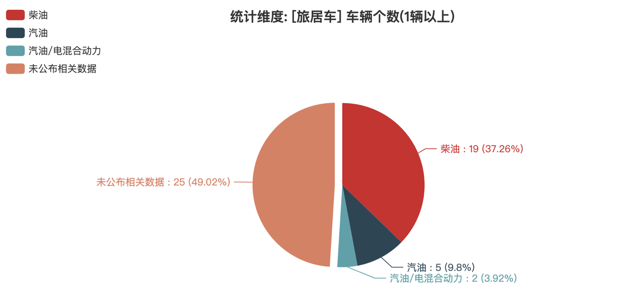 本次公告中的51款旅居車中,燃油種類情況如下:柴油(19輛,占比37.25%)、汽油(5輛,占比9.8%)、汽油/電混合動(dòng)力(2輛,占比3.92%)、未公布相關(guān)數(shù)據(jù)(25輛,占比49.02%)。