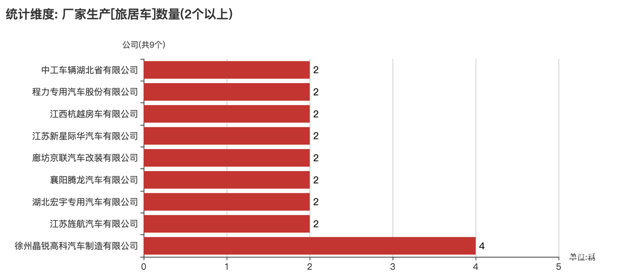 本次公告中的51款旅居車的生產(chǎn)企業(yè)共有40家,徐州晶銳高科汽車制造有限公司(4輛)、江蘇新星際華汽車有限公司(2輛)、江西杭越房車有限公司(2輛)、襄陽騰龍汽車有限公司(2輛)、江蘇旌航汽車有限公司(2輛)、程力專用汽車股份有限公司(2輛)、中工車輛湖北省有限公司(2輛)、廊坊京聯(lián)汽車改裝有限公司(2輛)、湖北宏宇專用汽車有限公司(2輛)、湖北瑞力汽車有限公司(1輛)、山東威士捷房車制造有限公司(1輛)、淄博恒立汽車制造有限公司(1輛)、鴻運(yùn)汽車有限公司(1輛)、江蘇法美瑞汽車有限公司(1輛)、程力汽車集團(tuán)股份有限公司(1輛)、山西普瑞萊斯汽車制造有限公司(1輛)、湖北四通專用汽車有限公司(1輛)、臨沂程通掛車制造有限公司(1輛)、湖北威爾特芬房車科技有限公司(1輛)、南京英德利汽車有限公司(1輛)、河北長安汽車有限公司(1輛)、重慶菜德機(jī)械制造有限公司(1輛)、江蘇振翔車輛裝備股份有限公司(1輛)、湖北浩天專用汽車有限公司(1輛)、安徽江淮專用汽車有限公司(1輛)、浙江淼盛汽車有限公司(1輛)、零八一電子集團(tuán)四川紅輪機(jī)械有限公司(1輛)、山東巨威汽車制造有限公司(1輛)、湖北中恒汽車裝備有限公司(1輛)、黑系智能裝備(威海)有限公司(1輛)、江蘇賽沸爾專用汽車有限公司(1輛)、藍(lán)際智能裝備(威海)有限公司(1輛)、湖北大力專用汽車制造有限公司(1輛)、眾銳工設(shè)(山東)房車制造有限公司(1輛)、河北覽眾專用汽車制造有限公司(1輛)、鄭州神汽汽車技術(shù)發(fā)展有限公司(1輛)、武漢市政環(huán)衛(wèi)機(jī)械有限公司(1輛)、威海子和智能裝備股份有限公司(1輛)、洛陽朗宸汽車有限公司(1輛)、重慶金冠汽車制造股份有限公司(1輛)。