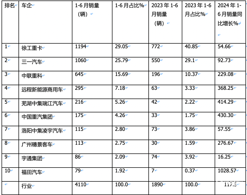 表3,根據(jù)終端上牌信息,2024年1-6月新能源攪拌車TOP10企業(yè)銷量分析: