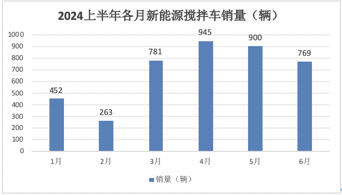終端上牌數(shù)據(jù)顯示,2024年6月新能源攪拌車銷售769輛,同比去年6月的501輛增長53.5%,環(huán)比5月的900輛下滑15.5%;2024年1-6月新能源攪拌車累計銷售4110輛,同比增長117.5%。