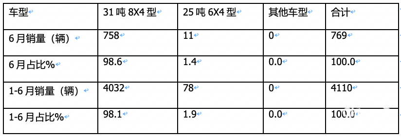 新能源攪拌車銷售769輛,同比增長53.5%,跑贏今年6月新能源重卡大盤149%的增速近95.5個百分點,表現(xiàn)較好;