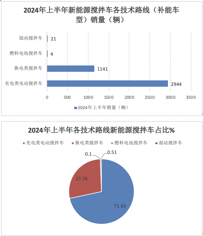上圖可見,按技術(shù)路線及補電方式劃分,在今年1-6月新能源攪拌車銷量結(jié)構(gòu)中: