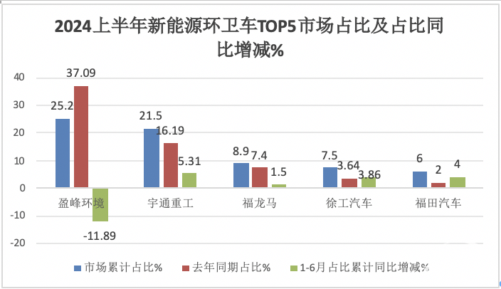在今年前6月新能源環(huán)衛(wèi)車市場競爭格局中,盈峰環(huán)境領(lǐng)跑,但占比同比市場份額減少最多;宇通占比同比增加5.31個(gè)百分點(diǎn),是占比同比增加最多的車企,表現(xiàn)搶眼。