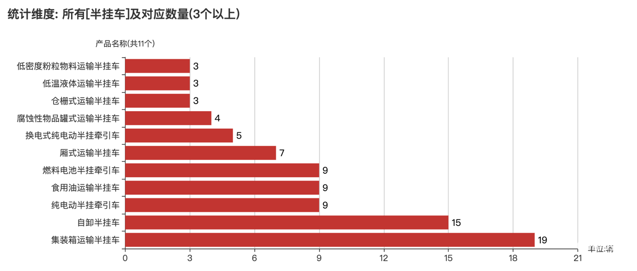 本次公告中的113款半掛車的車型共有30種,集裝箱運輸半掛車(19輛)、自卸半掛車(15輛)、燃料電池半掛牽引車(9輛)、純電動半掛牽引車(9輛)、食用油運輸半掛車(9輛)、廂式運輸半掛車(7輛)、換電式純電動半掛牽引車(5輛)、腐蝕性物品罐式運輸半掛車(4輛)、低密度粉粒物料運輸半掛車(3輛)、低溫液體運輸半掛車(3輛)、倉柵式運輸半掛車(3輛)、垃圾轉(zhuǎn)運半掛車(2輛)、連續(xù)油管作業(yè)半掛車(2輛)、半掛牽引車(2輛)、低平板半掛車(2輛)、氧化性物品罐式運輸半掛車(2輛)、鋁合金食用油運輸半掛車(2輛)、液態(tài)食品運輸半掛車(2輛)、易燃液體罐式運輸半掛車(2輛)、危險品罐箱骨架運輸半掛車(1輛)、雜項危險物品罐式運輸半掛車(1輛)、液化氣體運輸半掛車(1輛)、平板運輸半掛車(1輛)、冷藏半掛車(1輛)、散裝糧食運輸半掛車(1輛)、普通液體運輸半掛車(1輛)、平頭天然氣半掛牽引車(1輛)、側(cè)面自裝卸半掛車(1輛)、半掛牽引汽車(1輛)、電視半掛車(1輛)。