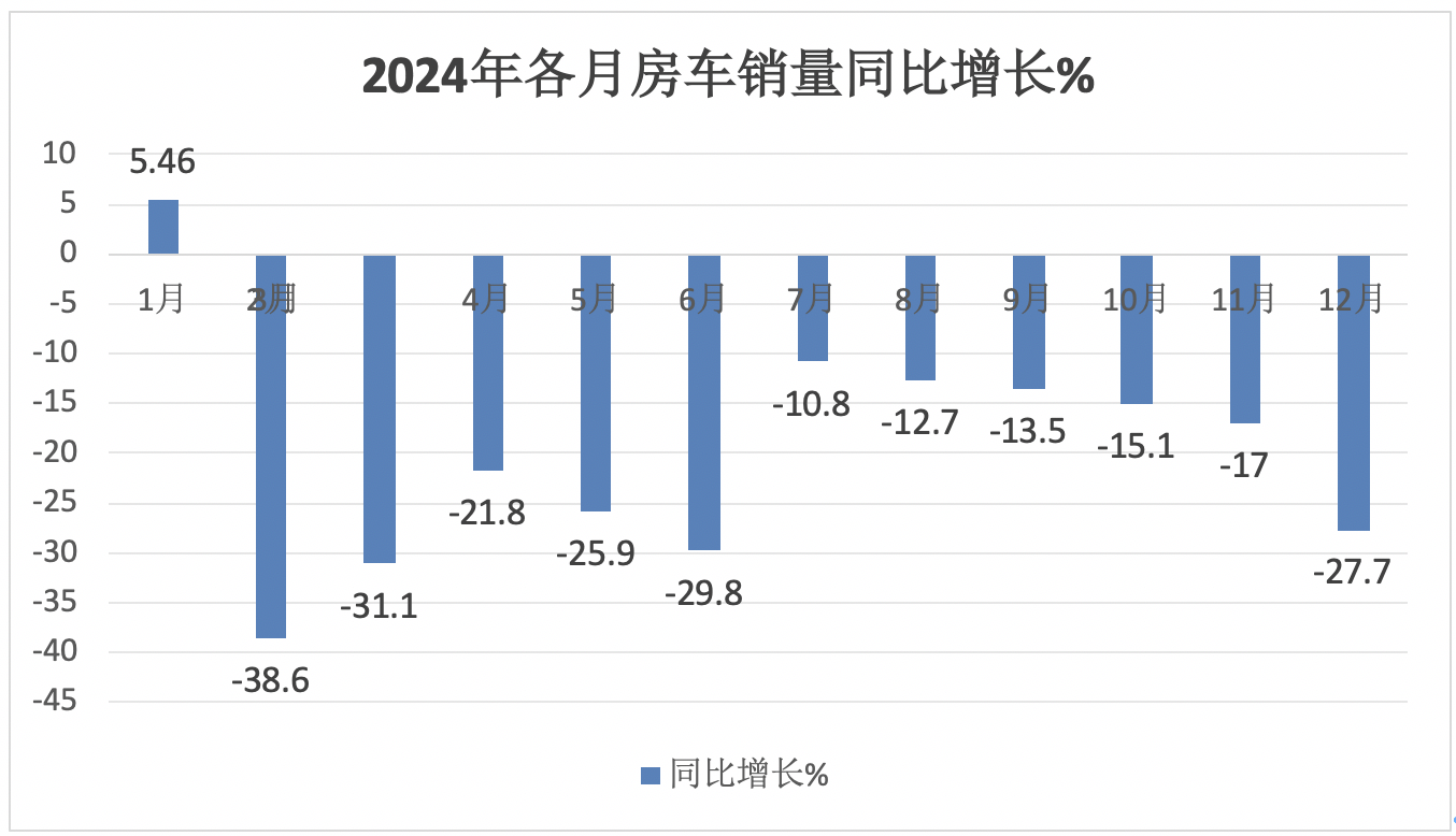 三:全年各月銷量同比依次呈現(xiàn)“1增11連降”,“下降”成為2024年國內(nèi)房車市場(chǎng)的“主旋律”